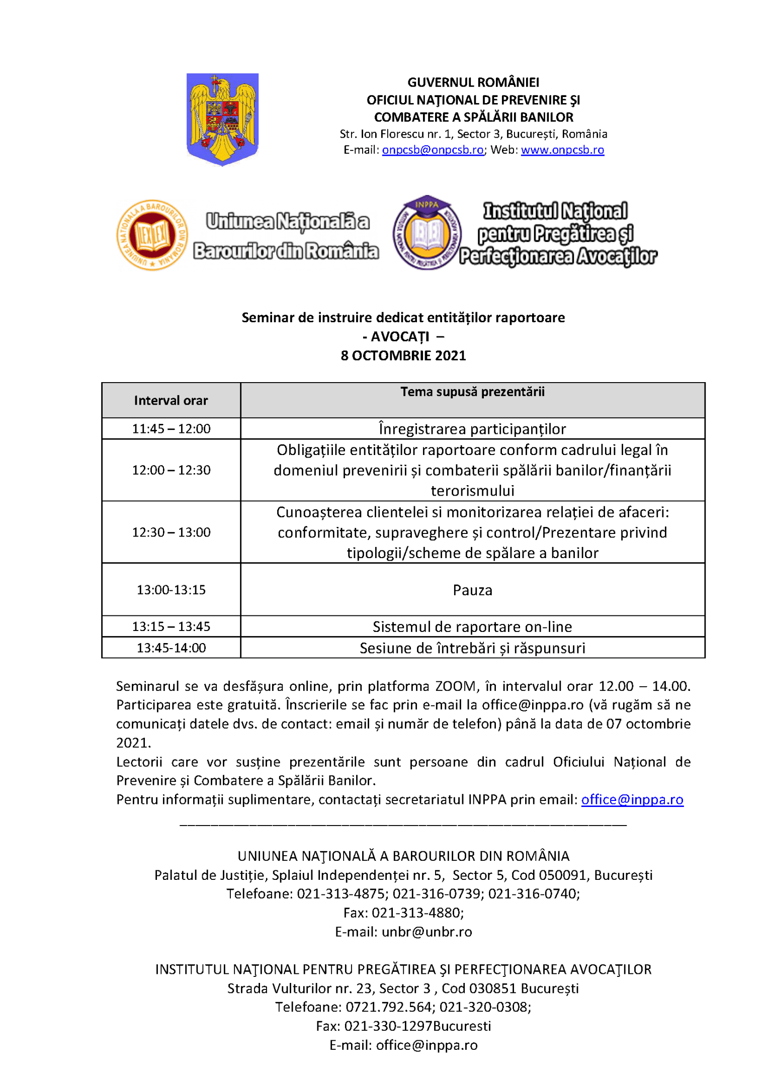 8 Octombrie 2021: Seminar online de instruire dedicat entităților raportoare – AVOCAȚI – organizat de UNBR și INPPA în colaborare cu ONPCSB. Participarea avocaților este gratuită (finanțarea este asigurată de UNBR & INPPA). Înscrierile se fac prin e-mail la office@inppa.ro