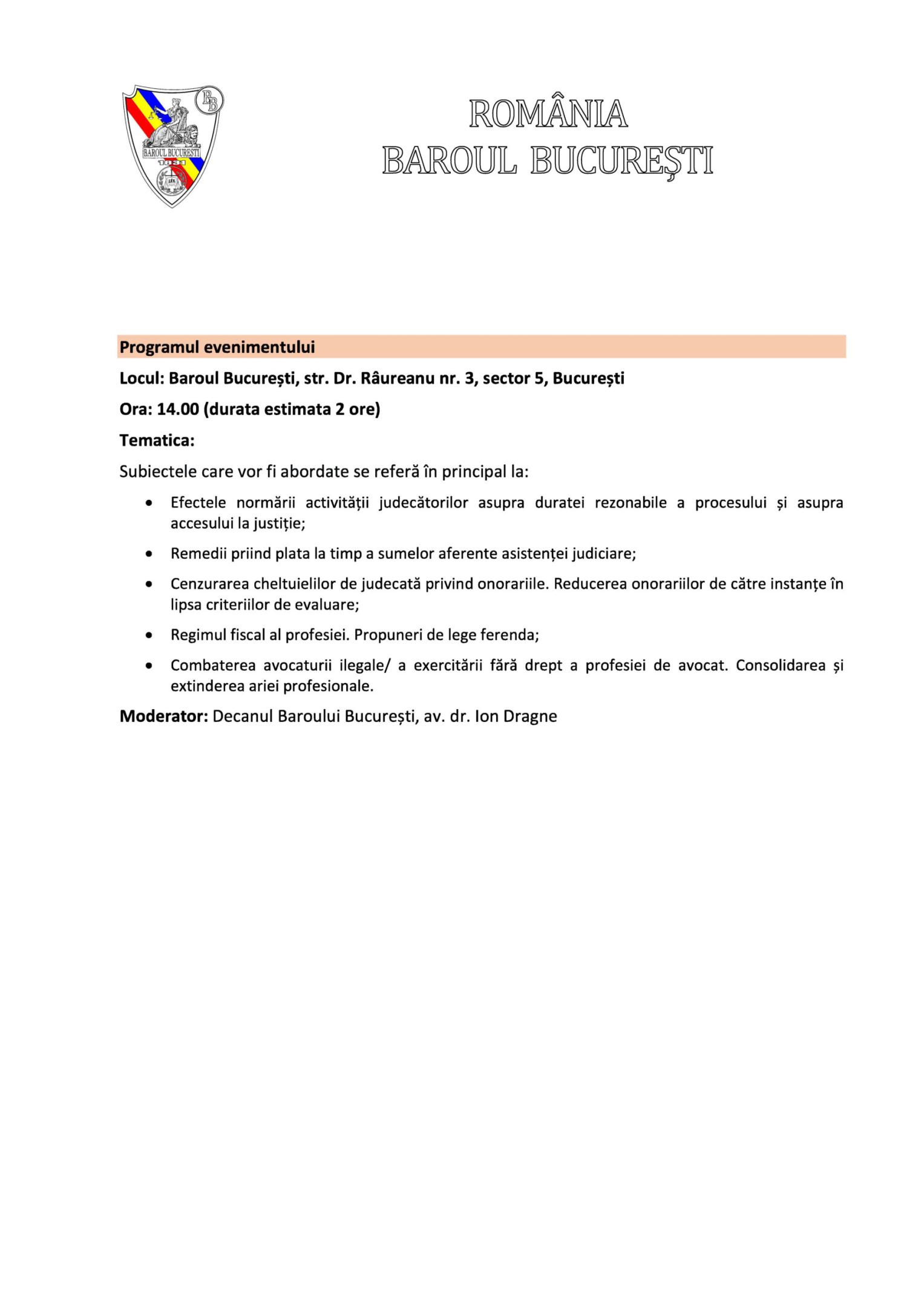 Esti aici: Prima Pagina / Agenda Presedintelui / Baroul București, Invitație de participare la masa rotundă cu tema „Profesia de avocat. Probleme și soluții” – 4 octombrie 2023
