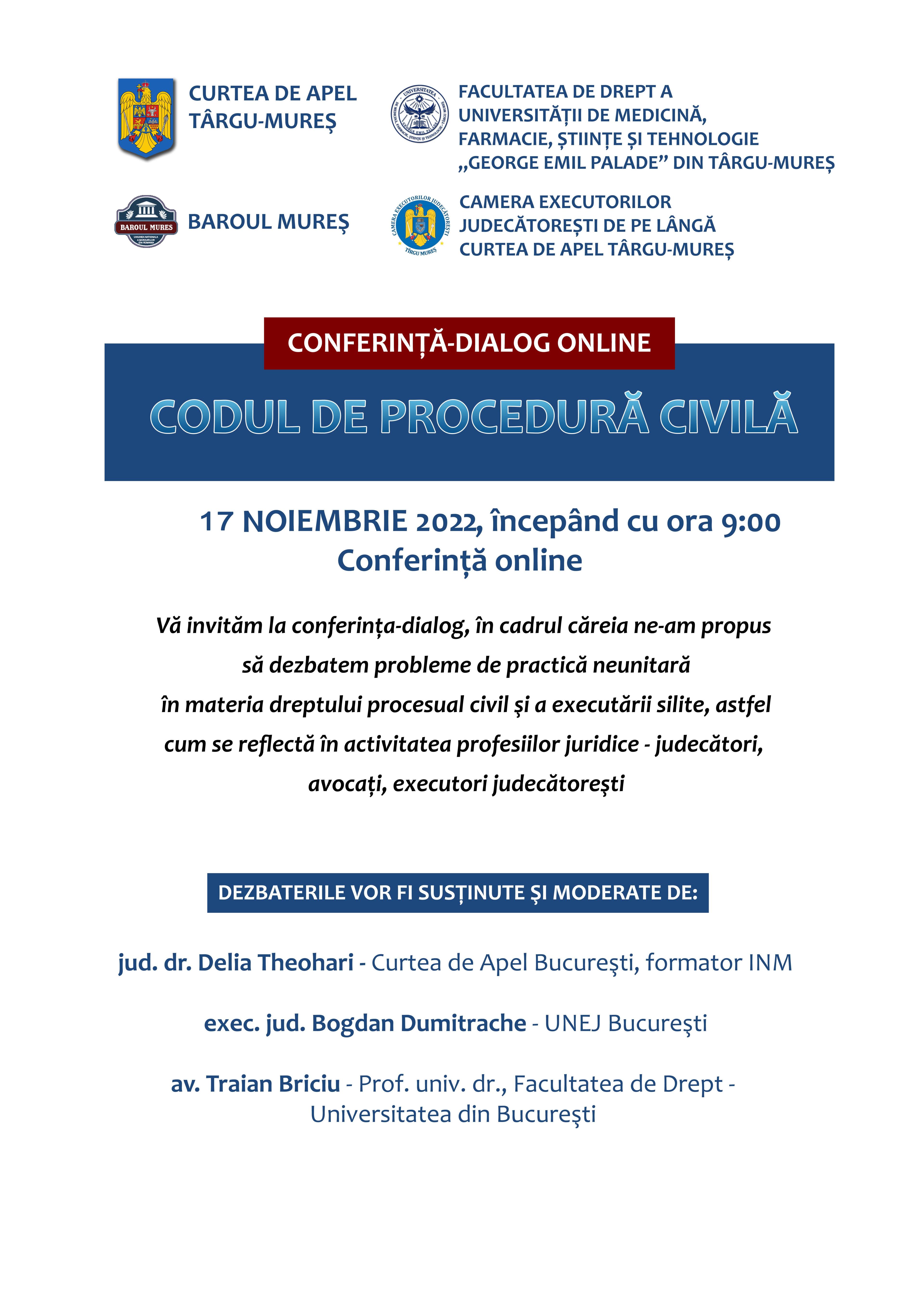 Esti aici: Prima Pagina / Agenda Presedintelui / Conferință comună – judecători, avocați, executori judecătorești – în domeniile drept civil, drept procesual civil și executare civilă, Târgu-Mureș