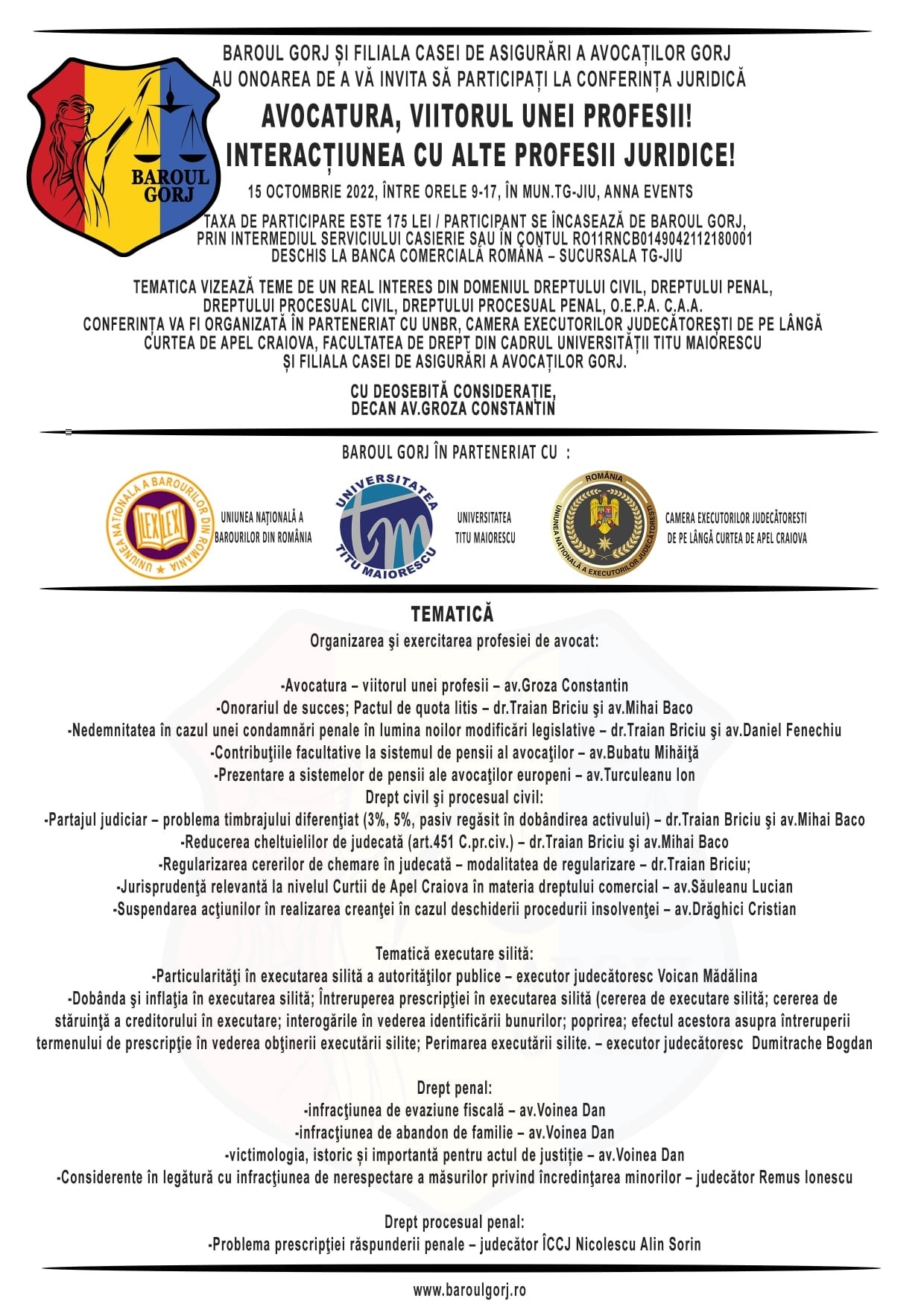 Conferința cu tema „Viitorul unei profesii !!! Interacțiunea cu alte profesii juridice !”, Baroul Gorj și Filiala CAA Gorj