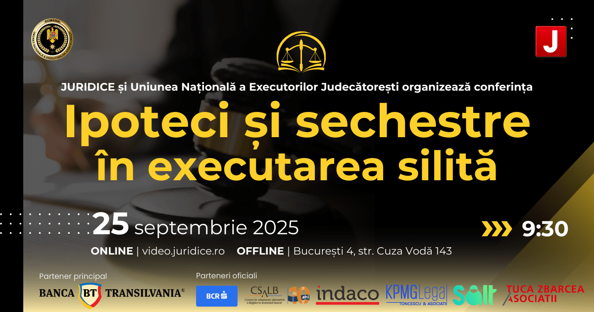 Conferința ”Ipoteci și sechestre în executarea silită”, joi 25 septembrie 2025. Un eveniment Juridice.ro și UNEJ