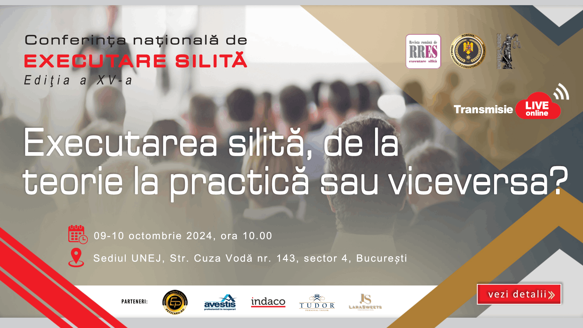 Revista Română de Executare Silită, Uniunea Națională a Executorilor Judecătorești și Grupul editorial Universul Juridic vă invită la cea de-a XV-a ediție a Conferinței Naționale de Executare Silită, cu tematica: „Executarea silită de la teorie la practică sau viceversa?”
