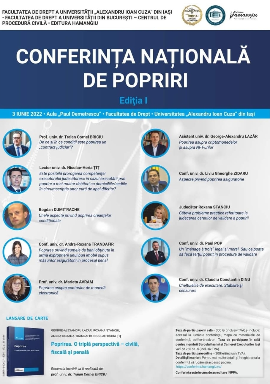 „Conferința Națională de Popriri” Iași, 3 iunie 2022. Organizatori: Facultatea de Drept a Universității din București – Centrul de procedură civilă, Facultatea de Drept a Universității „Alexandru Ioan Cuza” din Iași și Editura Hamangiu