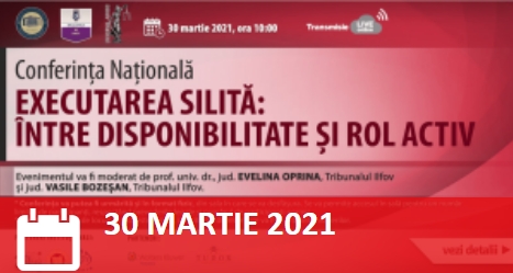 Facultatea de Drept, Universitatea București, Facultatea de Drept, Universitatea Titu Maiorescu și Editura Universul Juridic organizează, în data de 30 martie 2021, începând cu ora 10:00, Conferința Națională „Executarea silită: între disponibilitate și rol activ”.