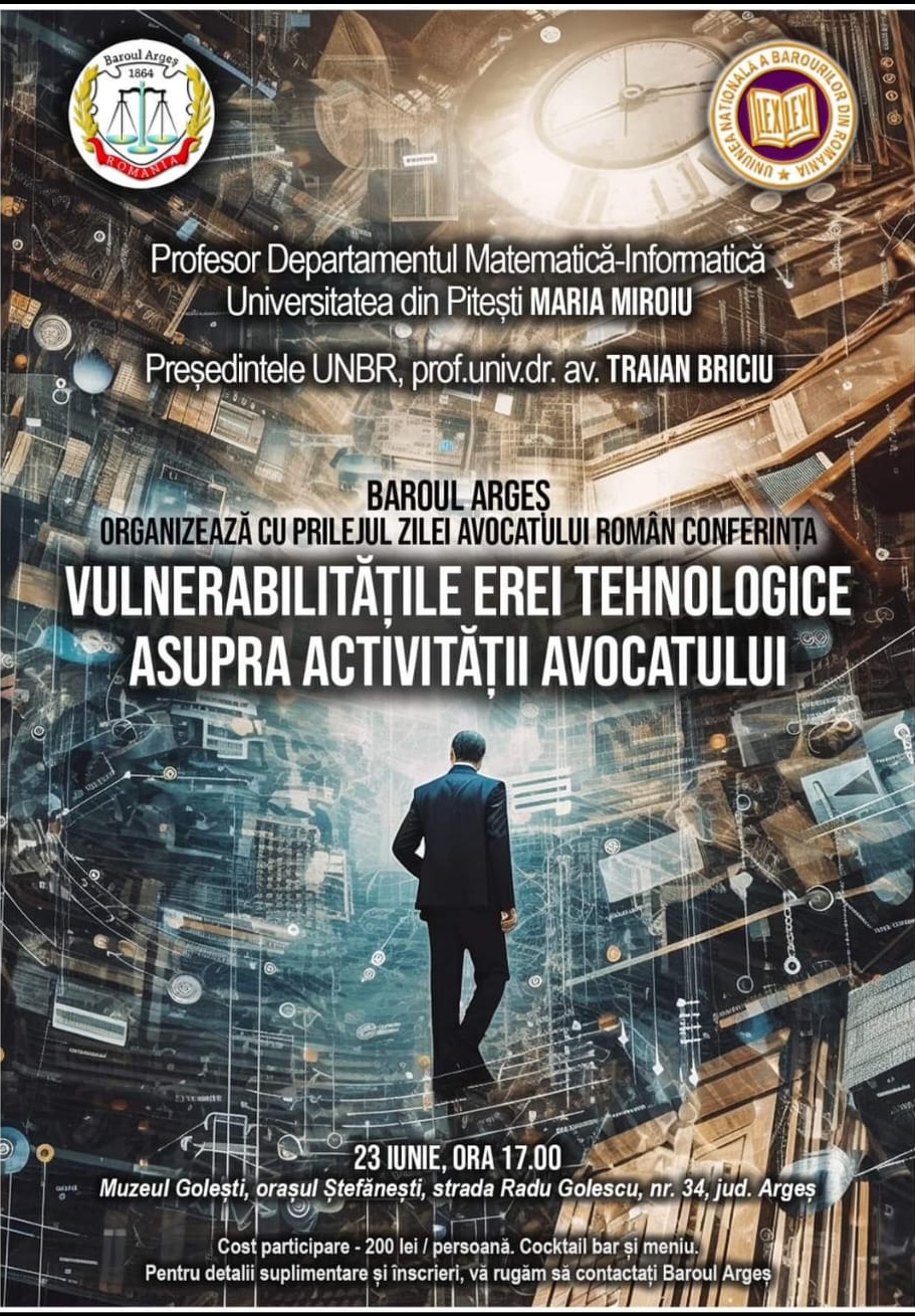 Esti aici: Prima Pagina / Agenda Presedintelui / Conferința profesională cu tema ”Vulnerabilitățile erei tehnologice asupra activității avocatului” organizată de Baroul Argeș cu prilejul ZILEI AVOCATULUI ROMÂN