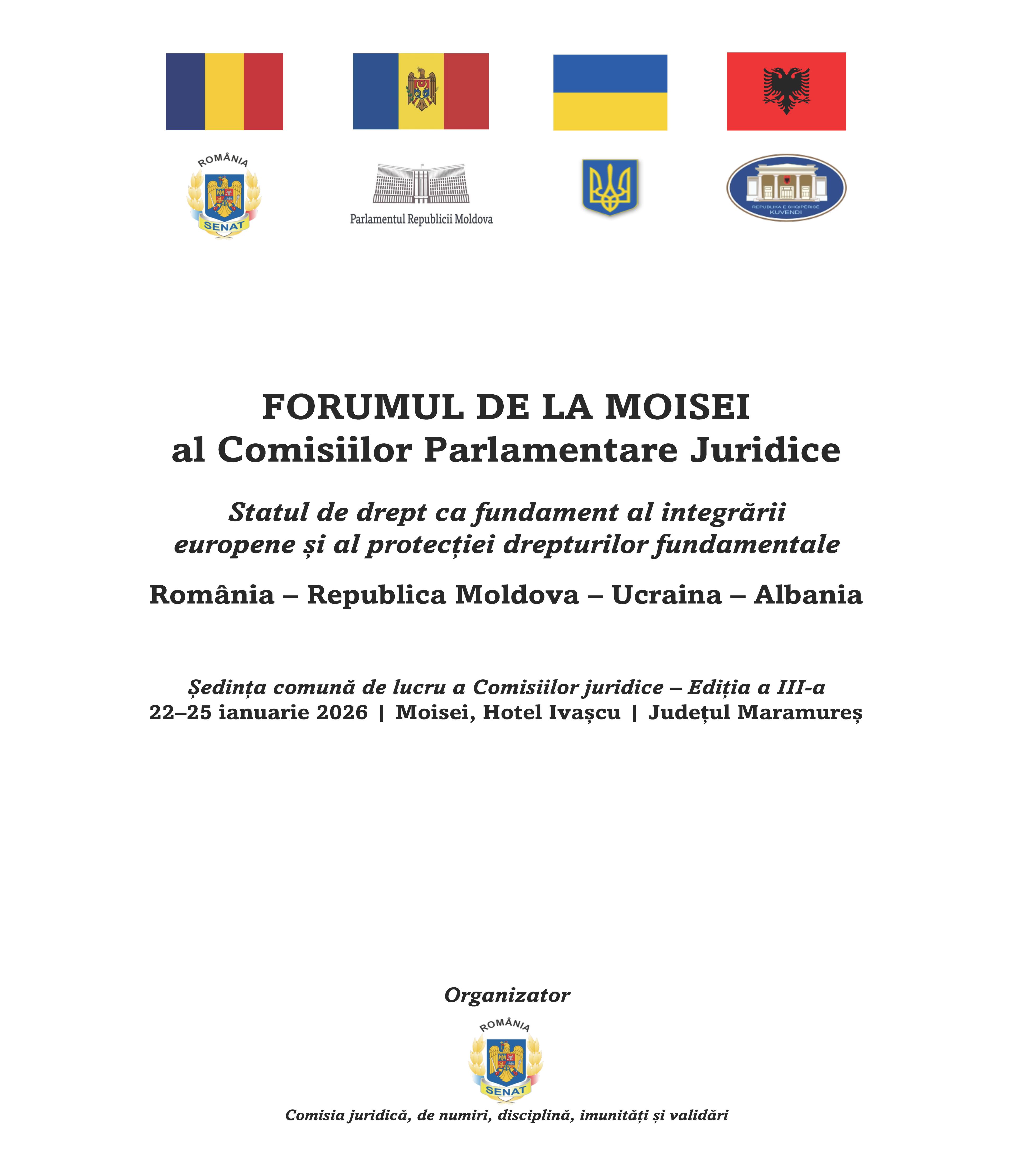 FORUMUL DE LA MOISEI al Comisiilor Parlamentare Juridice. Statul de drept ca fundament al integrării europene și al protecției drepturilor fundamentale. România – Republica Moldova – Ucraina – Albania. Ședința comună de lucru a Comisiilor juridice – Ediția a III-a