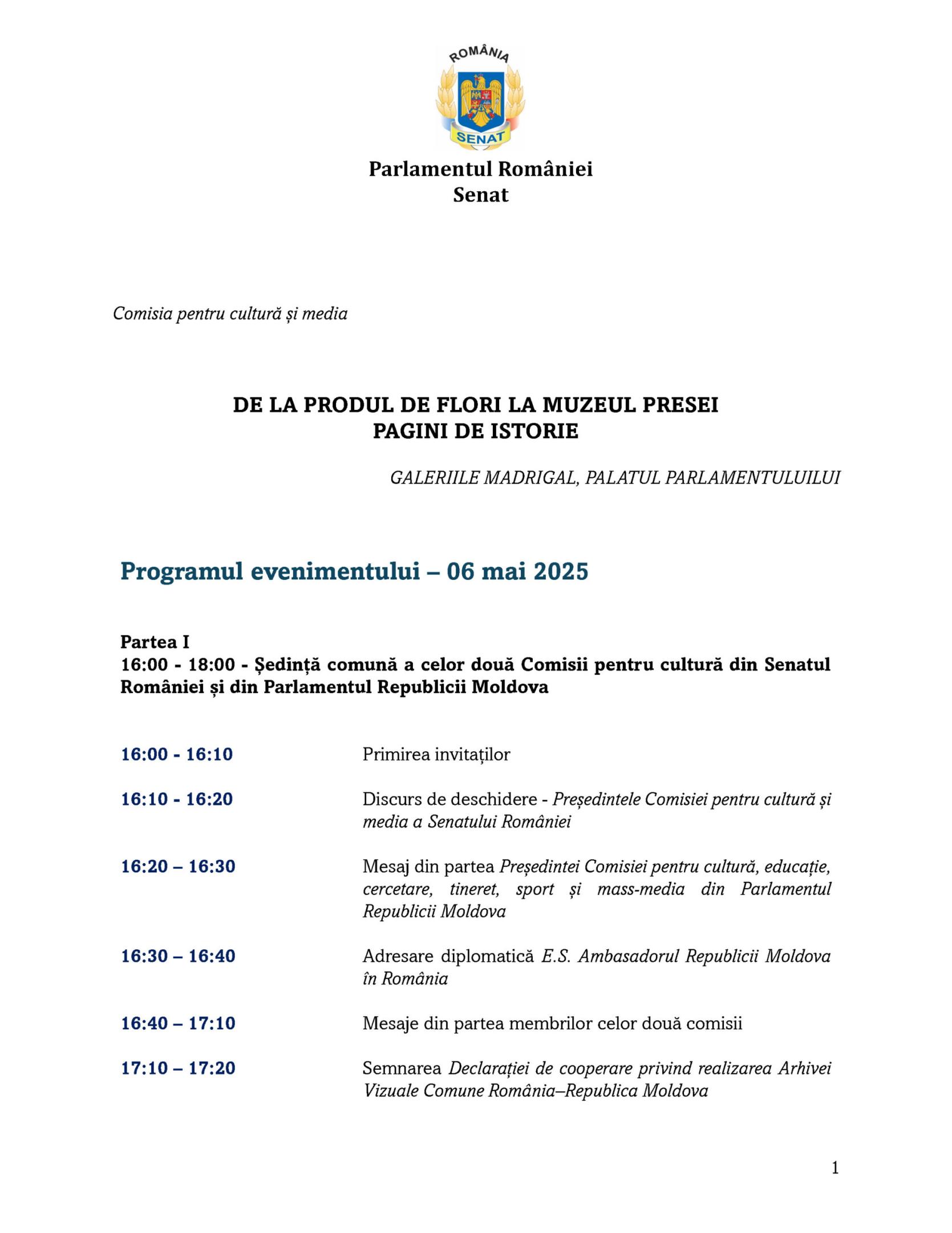 06 mai - Marți, 06 mai 2025, orele 18:00 - 20:00, Palatul Parlamentului, Galeriile Madrigal, etaj 1M