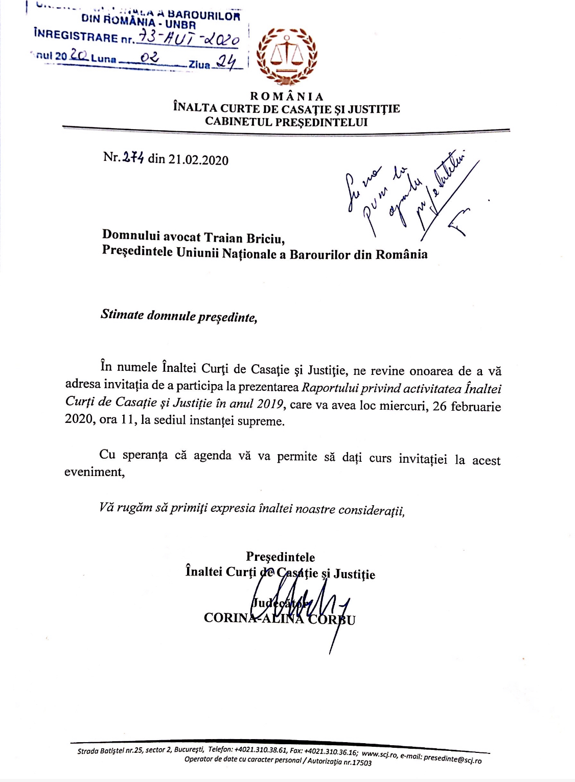 Invitație la prezentarea raportului privind activitatea Inaltei Curti de Casatie si Justitie in anul 2019 – 26.02.2020, ora 11.00, la sediul Inaltei Curti de Casatie si Justitie