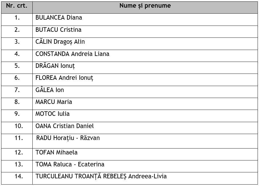 În urma Anunțului referitor la selecția candidatului României pentru funcția de judecător la Tribunalul Uniunii Europene, publicat la data de 19 aprilie 2021, în temeiul Memorandumului cu tema „Aprobarea procedurii pentru desemnarea candidatului României pentru funcţia de judecător la Tribunalul Uniunii Europene”, comunicăm faptul că întrunesc condițiile de participare la interviu următorii candidați: