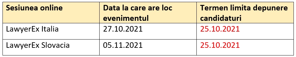 Apel la candidaturi pentru sesiunile online din cadrul proiectului LAWYEREX Update! Până la 25 octombrie 2021 pot fi depuse candidaturile pentru sesiunile LawyerEx Italia și LawyerEx Slovacia !