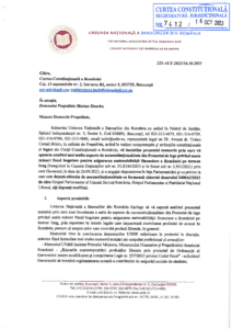 La 16 octombrie a.c., conform celor decise în cadrul întâlnirii dintre membrii Comisiei Permanente a UNBR și decanii barourilor, UNBR a înregistrat la Curtea Constituțională a României memoriul prin care se solicită analiza mai multor aspecte de neconstituționalitate din Proiectul de lege privind unele măsuri fiscal bugetare pentru asigurarea sustenabilității financiare a României pe termen lung (înregistrat la Camera Deputaților sub nr. PLX546/2023 și la Senat sub nr. L551/2023).