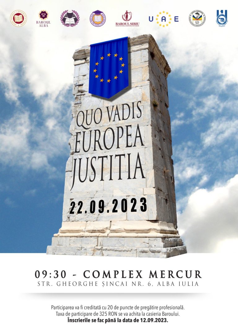 Baroul Alba organizează conferința ”QUO VADIS EUROPEA JUSTITIA” vineri, 22 septembrie 2023, începând cu ora 09,30 la Alba Iulia, Complex ”MERCUR”, str. Gheorghe Șincai nr. 6.