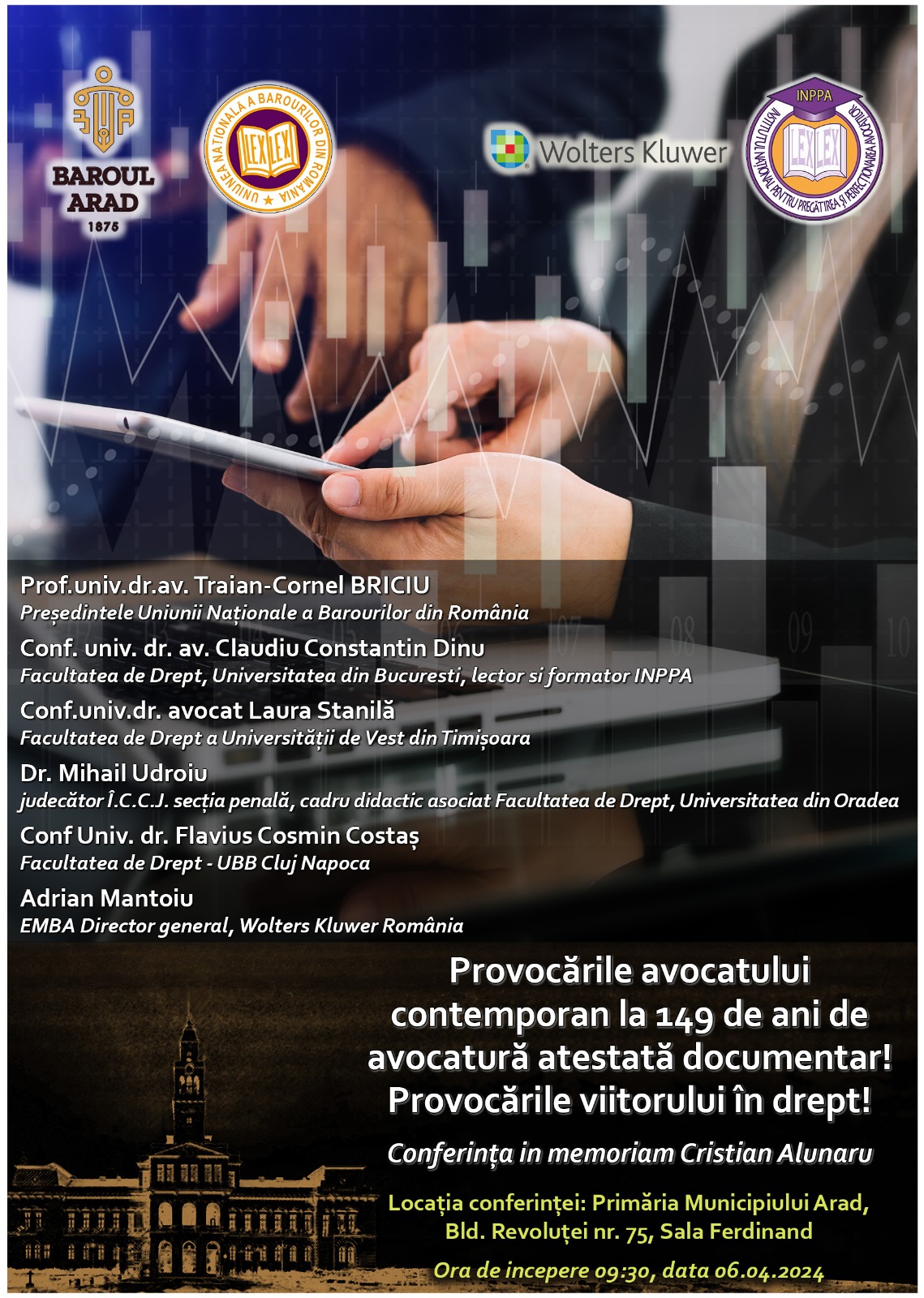 Marcând 149 de ani de atestare documentară, Baroul Arad, alături de partenerii săi – Uniunea Națională a Barourilor din România (UNBR), Institutul Național pentru Pregătirea și Perfecționarea Avocaților (INPPA) și Wolters Kluwer România – are deosebita plăcere de a vă ura bun venit la conferința ”Provocările avocatului contemporan la 149 de ani de avocatură atestată documentar! Provocările viitorului în drept!”.