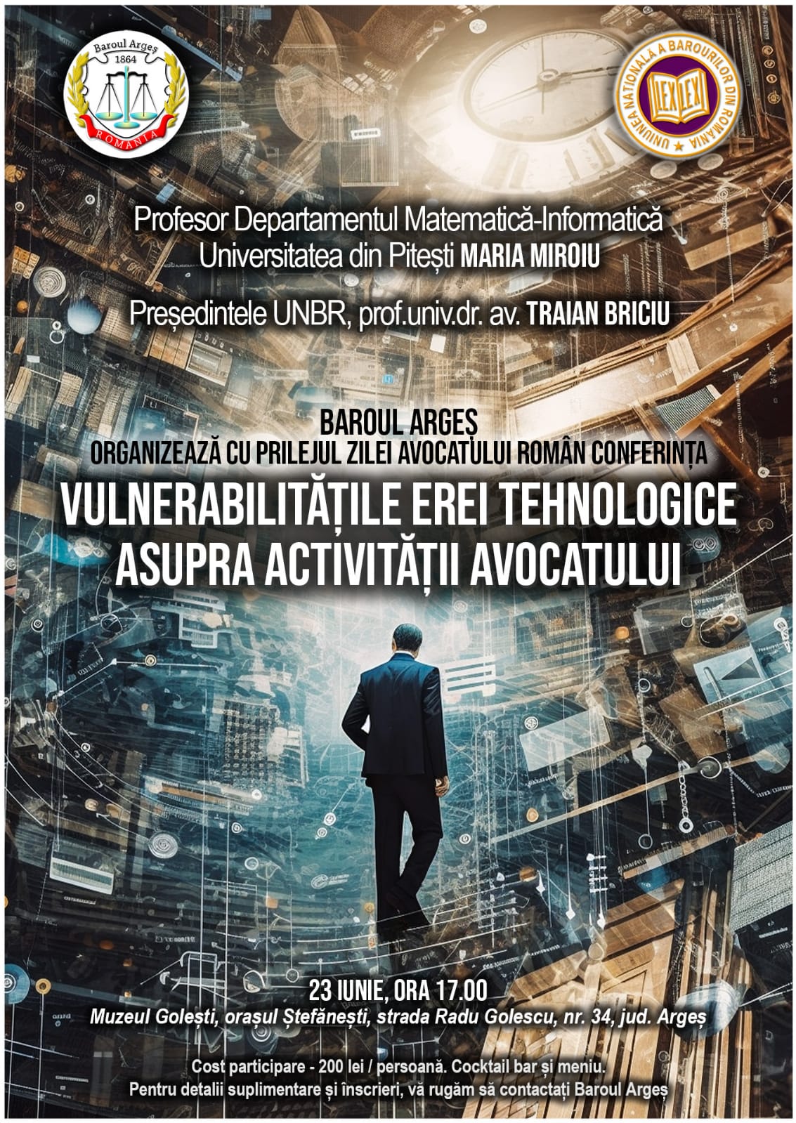 Cu ocazia Zilei Avocatului Român, Baroul Argeș va invita în data de 23 iunie 2023 la Muzeul Golești începând cu ora 17 la conferința cu titlul „Vulnerabilitățile erei tehnologice asupra activității avocatului” avându-i ca speakeri pe Profesor de informatica Maria Miroiu, Universitatea din Pitești și pe președintele UNBR , Avocat dr. Traian Briciu.