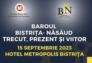 În data de 15.09.2023, BAROUL BISTRIȚA NĂSĂUD a aniversat împlinirea a 100 de ani de la înființare ocazie cu care a organizat Conferința Aniversară Centenară ”BAROUL BISTRIȚA NĂSĂUD. TRECUT, PREZENT ȘI VIITOR” si o Cină de Gală.