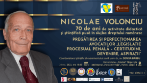 Facultatea de Drept și Științe Administrative, Universitatea „Valahia” din Târgoviște, Baroul Dâmbovița, în parteneriat cu Grupul editorial Universul Juridic, organizează vineri, 21 octombrie 2022, începând cu ora 10.00, în Amfiteatrul „Paraschiv Vagu” al Facultății de Drept și Științe Administrative, Universitatea „Valahia” din Târgoviște , Conferința In Honorem prof. univ. dr. N. Volonciu – 70 de ani de activitate didactică și științifică pusă în slujba dreptului românesc, urmată de conferința de pregătire și perfecționare a avocaților conform noii metodologii de recunoaștere a activităților de pregătire profesională continuă a avocaților , cu acordarea de puncte având ca temă „Legislația procesual penală – certitudini, devenire, aspirații”.