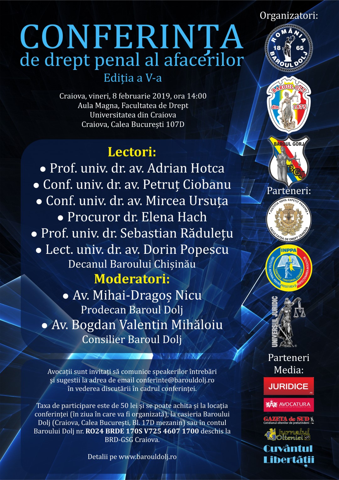 Baroul Dolj: Conferința de drept penal al afacerilor, vineri 8 februarie 2019, ora 14.00