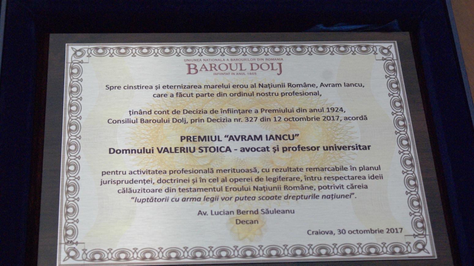 Baroul Dolj i-a acordat avocatului și profesorului VALERIU STOICA Premiul „Avram Iancu” pentru anul 2017. Decernarea premiului a fost motivată de activitatea remarcabilă în domeniul dreptului, ce se întinde pe mai bine de 40 de ani. Premiul a fost înfiinţat în anul 1924, spre cinstirea şi eternizarea marelui erou al Naţiunii Române Avram Iancu, care a făcut parte din ordinul profesional al avocaţilor.”