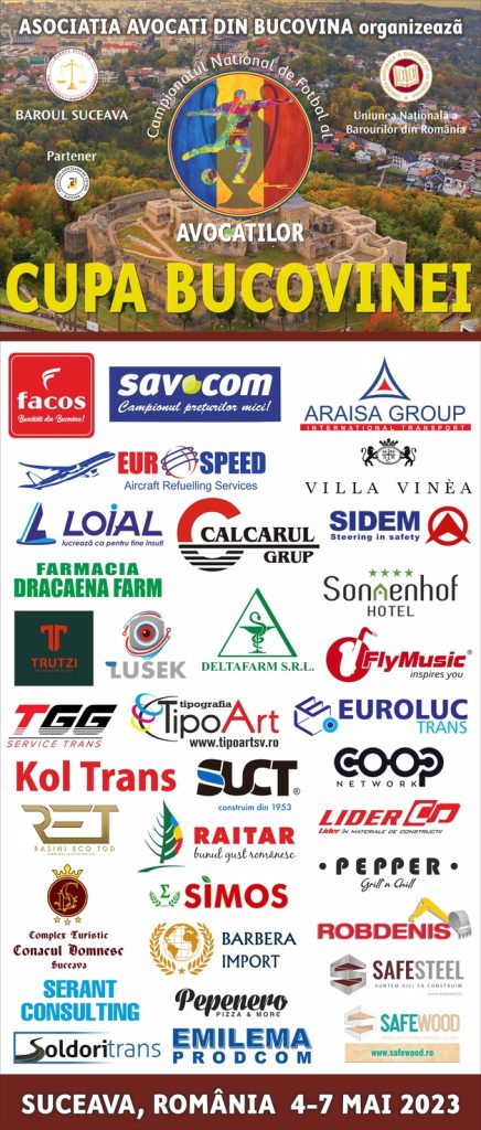 Baroul Suceava și Asociația “Avocați din Bucovina” au bucuria să vă anunțe că în perioada 04-07 mai 2023 va avea loc la Suceava competiția sportivă anuală de fotbal a avocaților, organizată sub denumirea “Cupa Bucovinei”.
