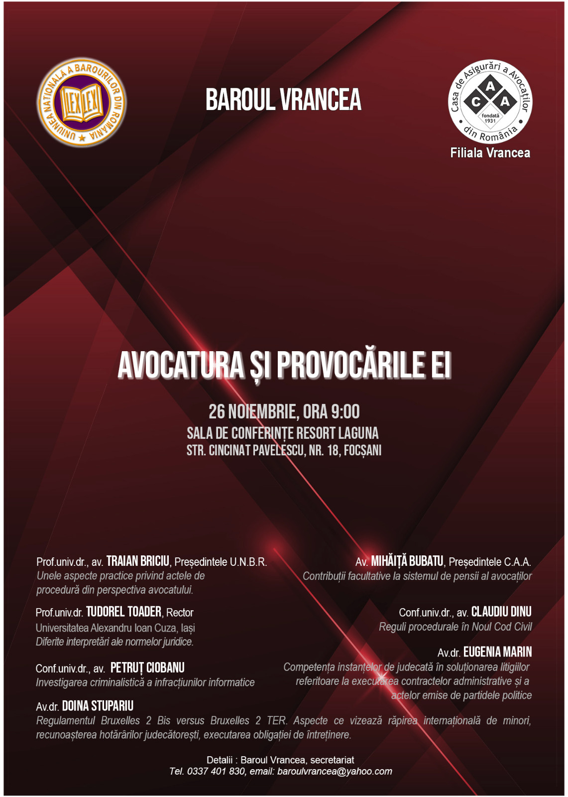 Pe data de 26.11.2022, între orele 9 – 18, Baroul Vrancea organizează conferința de pregătire profesională ”Avocatura și provocările ei”.