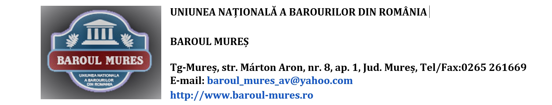 Având în vedere intenţia Guvernului României de a aduce modificări Codului fiscal, în sensul obligării avocaților la plata cotei CASS în sistem real, neplafonat și impactul major al unor asemenea prevederi asupra profesiei de avocat, Baroul Mureș își exprimă dezaprobarea cu privire la intenționata majorare a contribuţiilor fiscale preconizate.