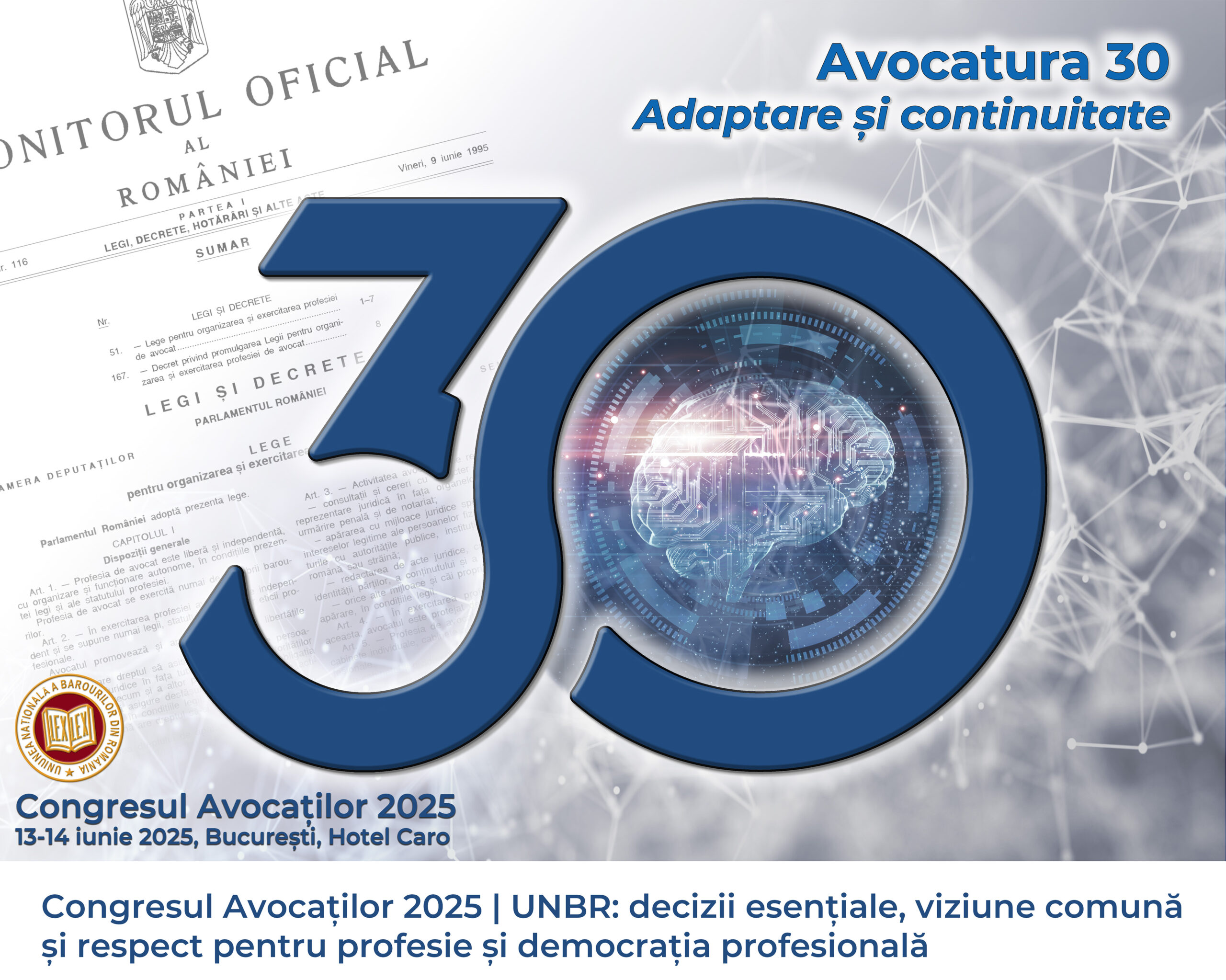 Uniunea Națională a Barourilor din România (UNBR) anunță încheierea Congresului Avocaților 2025, desfășurat în perioada 13–14 iunie la București, sub tema „Avocatura 30. Adaptare și continuitate”. Ediția din acest an a avut o semnificație specială, marcând trei decenii de la intrarea în vigoare a Legii nr. 51/1995 privind organizarea și exercitarea profesiei de avocat. Timp de două zile, delegați din toate barourile, membri ai conducerii profesiei au analizat provocările actuale ale avocaturii, au adoptat decizii cu impact strategic și au reafirmat valorile care stau la temelia profesiei de avocat.