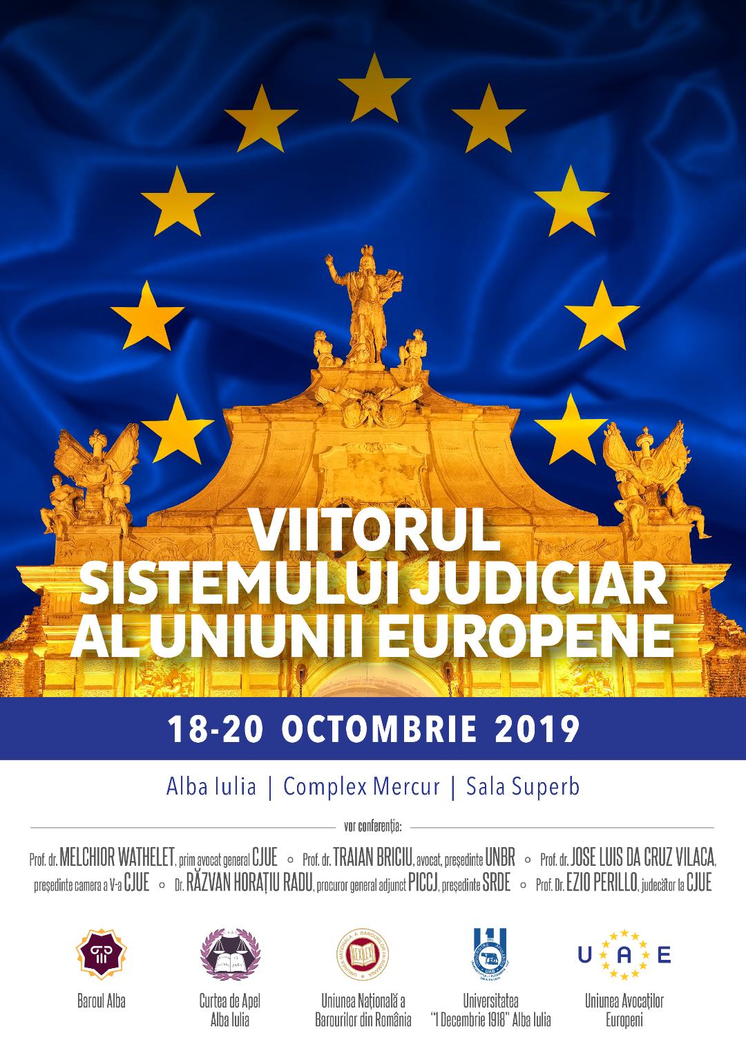 Baroul Alba împreună cu Curtea de Apel Alba Iulia, Baroul Hunedoara, în parteneriat cu U.N.B.R., U.A.E. și Universitatea „1 Decembrie 1918 Alba Iulia”, organizează în cadrul activității de pregătire profesională continuă a avocaților, în data de 19 Octombrie 2019, ora 09:00, la Sala „Superb” a „Complexului Mercur” din Alba Iulia, str. Vasile Alecsandri nr. 68, conferința: