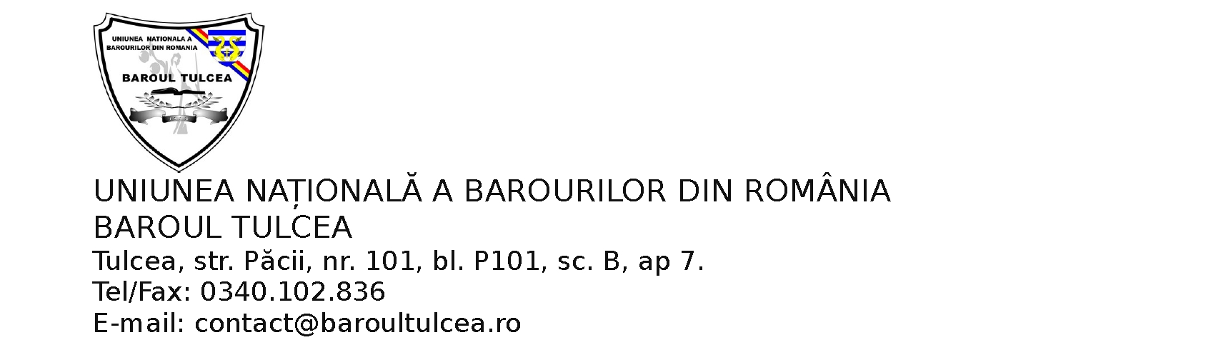 Baroul Tulcea, alături de Uniunea Națională a Barourilor din România și de celelalte barouri, manifestă în continuare deplină deschidere la dialog instituțional și va utiliza toate mijloacele legale pentru a împiedica adoptarea unor asemenea dispoziții nelegale, inechitabile și vădit discriminatorii, neexcluzând organizarea unor ample mișcări de protest, în cazul în care corpul profesional al avocaților le va solicita.