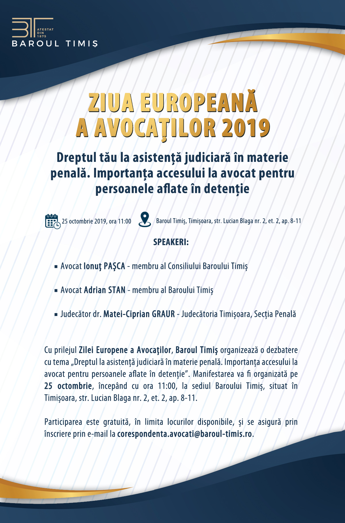 Cu prilejul Zilei Europene a Avocaților, Baroul Timiș organizează o dezbatere cu tema „Dreptul la asistență judiciară în materie penală. Importanța accesului la avocat pentru persoanele aflate în detenție”. Manifestarea va fi organizată la 25 octombrie, începând cu ora 11:00 la sediul Baroului Timiș, situat în Timișoara, str. Lucian Blaga nr. 2, et. 2, ap. 8-11.