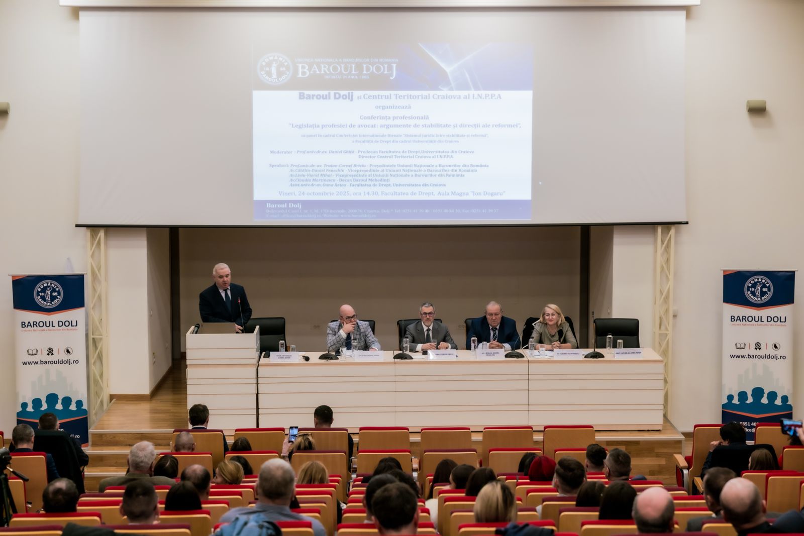 Craiova, 24 octombrie 2025 – Aula Magna „Ion Dogaru” a Facultății de Drept din Craiova a găzduit conferința „Legislația profesiei de avocat: argumente de stabilitate și direcții ale reformei”, organizată de Baroul Dolj și Centrul Teritorial Craiova al INPPA, în cadrul Conferinței Internaționale Bienale „Sistemul juridic între stabilitate și reformă”.