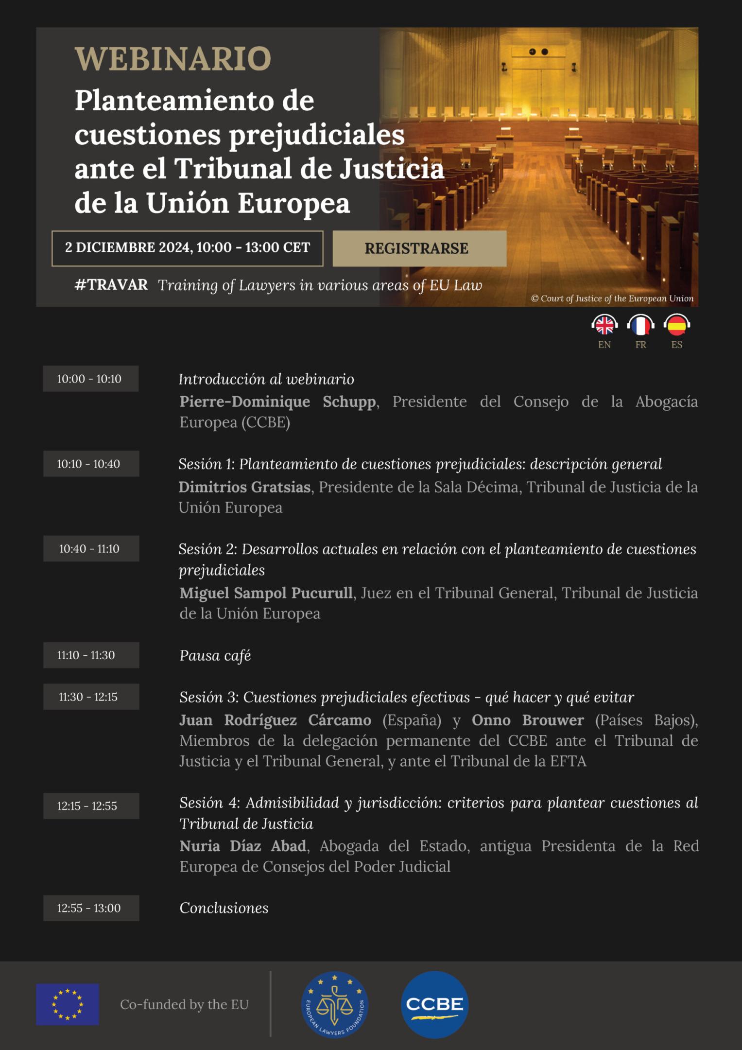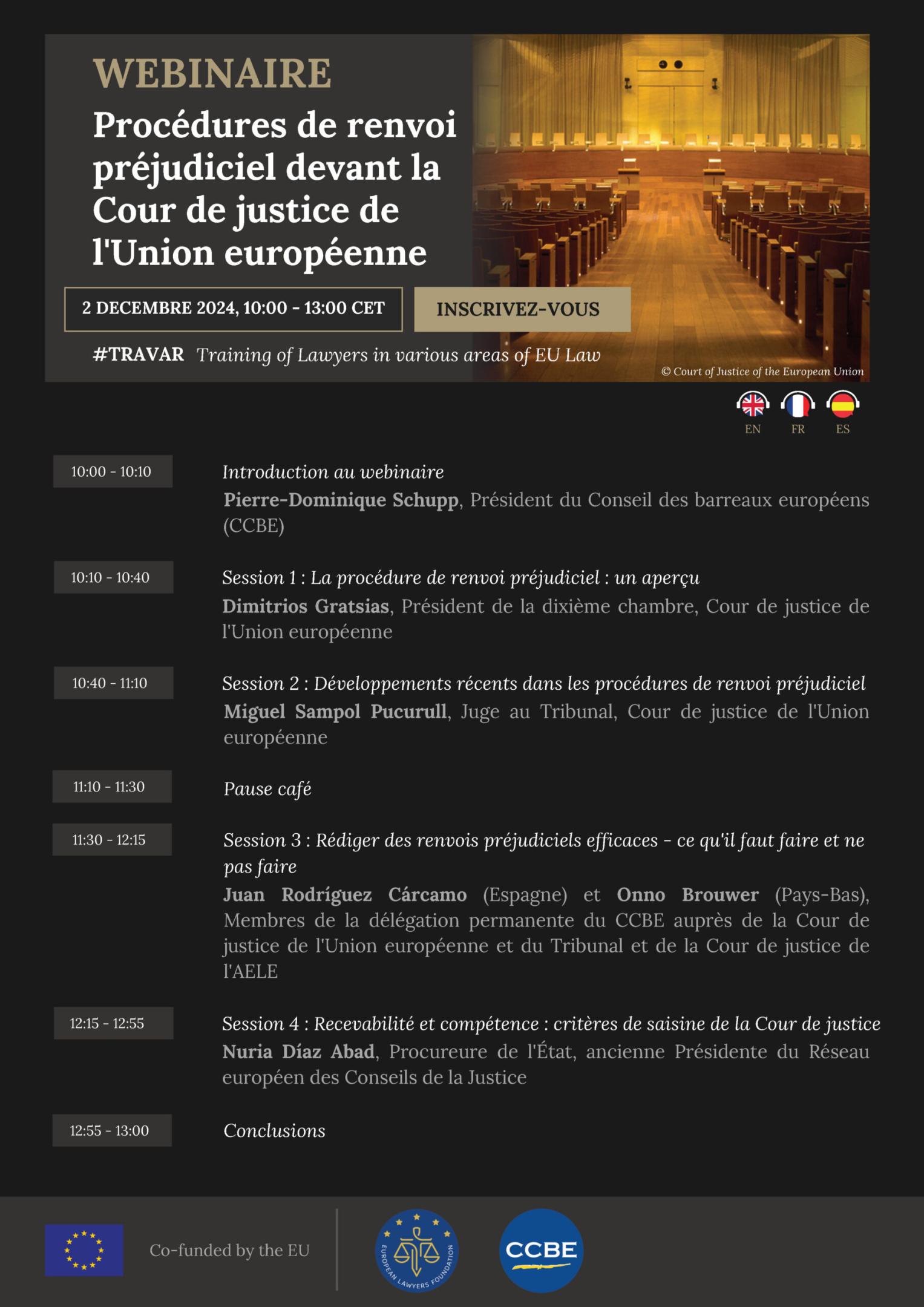 European Lawyers Foundation (ELF) și Consiliul Barourilor și Societăților de Drept din Europa (CCBE) organizează ultimul webinar din anul 2024, dedicat procedurilor de trimitere preliminară în fața Curții de Justiție a Uniunii Europene.