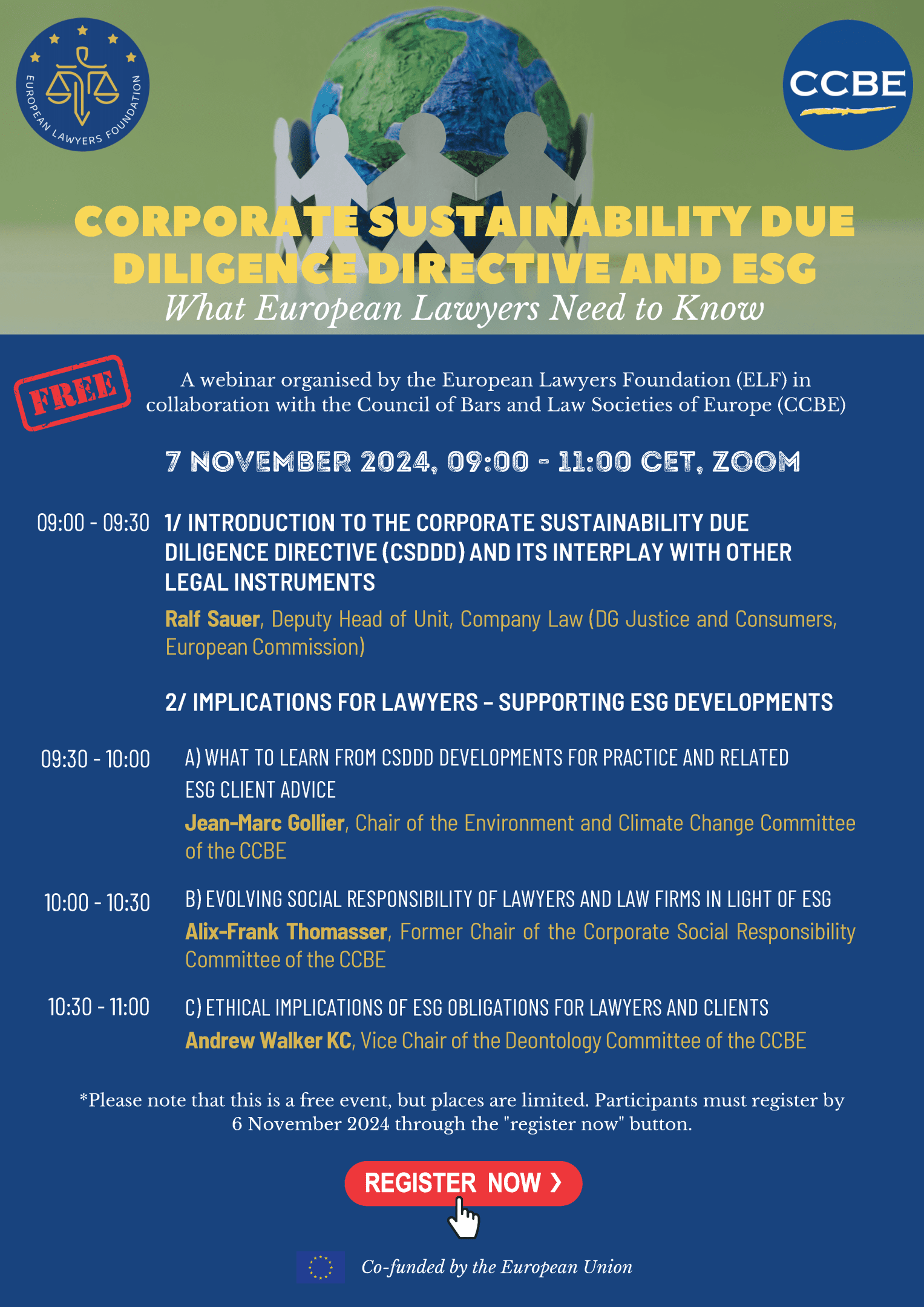 European Lawyers Foundation și Consiliul Barourilor și Societăților de Drept din Europa (CCBE) organizează în 7 noiembrie 2024, între orele 9:00 și 11:00, un webinar gratuit dedicat Directivei de due diligence pentru sustenabilitate corporativă. Evenimentul are ca scop informarea avocaților europeni cu privire la reglementările recente și implicațiile acestora în domeniul sustenabilității corporative, evoluția responsabilității sociale a avocaților și a cabinetelor de avocatură prin raportare la noul domeniu ESG (Environmental, Social, Governance │ Mediu, Societate și Guvernanță) și implicațiile etice ale obligațiilor ESG pentru avocați și clienți.