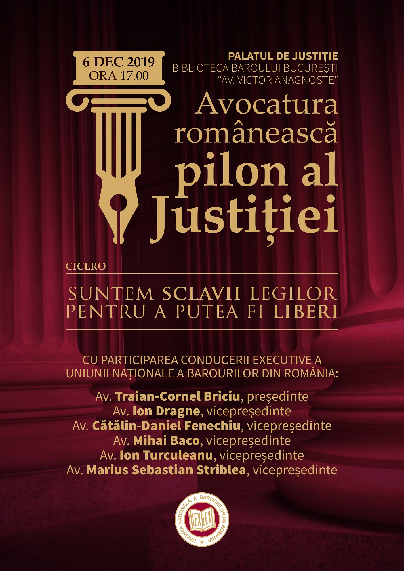 Eveniment. ”Avocatura românească pilon al Justiției”, vineri 6 decembrie orele 17,00 la Biblioteca Baroului București cu participarea Conducerii executive a Uniunii Naționale a Barourilor din România: Președinte: av. Traian-Cornel Briciu, Vicepreședinți: av. Ion Dragne, av. Cătălin-Daniel Fenechiu, av. Mihai Baco, av. Ion Turculeanu și av. Marius-Sebastian Striblea.