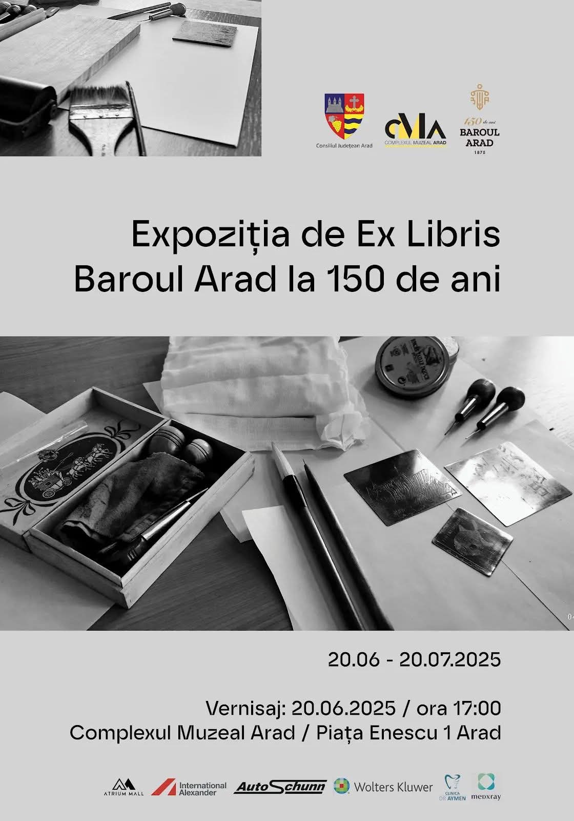 Vineri, 20 iunie 2025, ora 17:00, la Complexul Muzeal Arad, Piața George Enescu nr. 1 a avut loc vernisajul expoziției de Ex Libris „Baroul Arad la 150 de ani”.