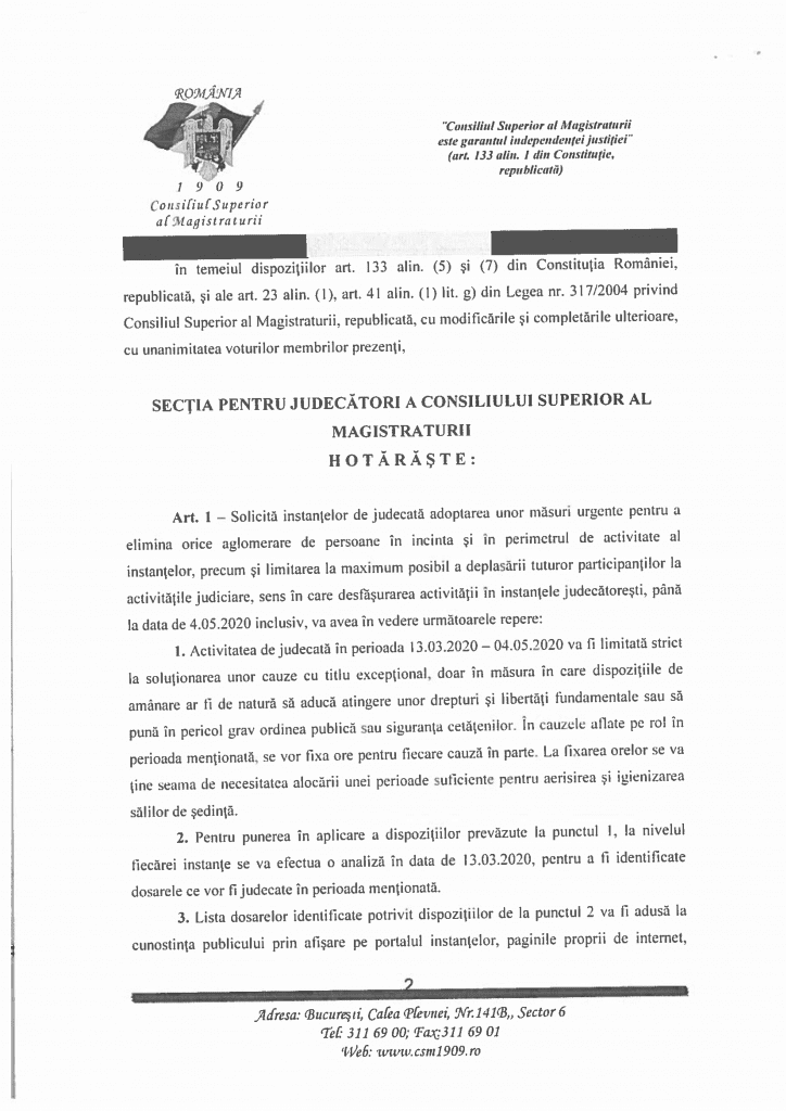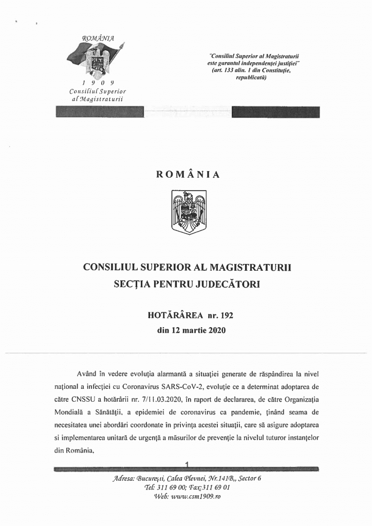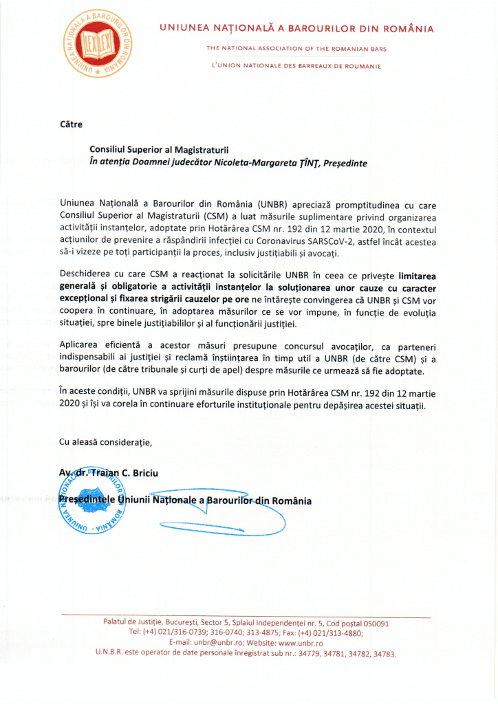 Hotărârea Consiliului Superior al Magistraturii (CSM) nr. 192 din 12 martie 2020 privind măsuri suplimentare pentru organizarea activității instanțelor, în contextul acțiunilor de prevenire a răspândirii infecției cu Coronavirus SARS-CoV-2 și Adresa Uniunii Naționale a Barourilor din România (UNBR) care apreciază promptitudinea cu care CSM a luat măsurile din Hotărârea nr. 192/12.03.2020 care vizează pe toți participanții la proces, inclusiv justițiabili și avocați