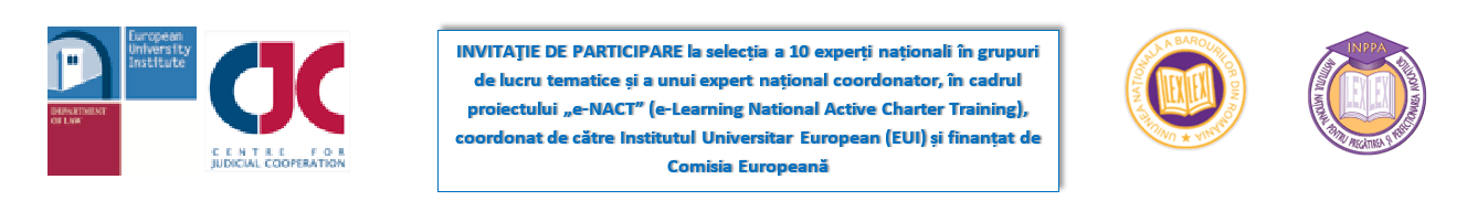 la selecția a 10 experți naţionali în grupuri de lucru tematice și a unui expert naţional coordonator, în cadrul proiectului „e-NACT” (e-Learning National Active Charter Training), coordonat de către Institutul Universitar European (EUI)