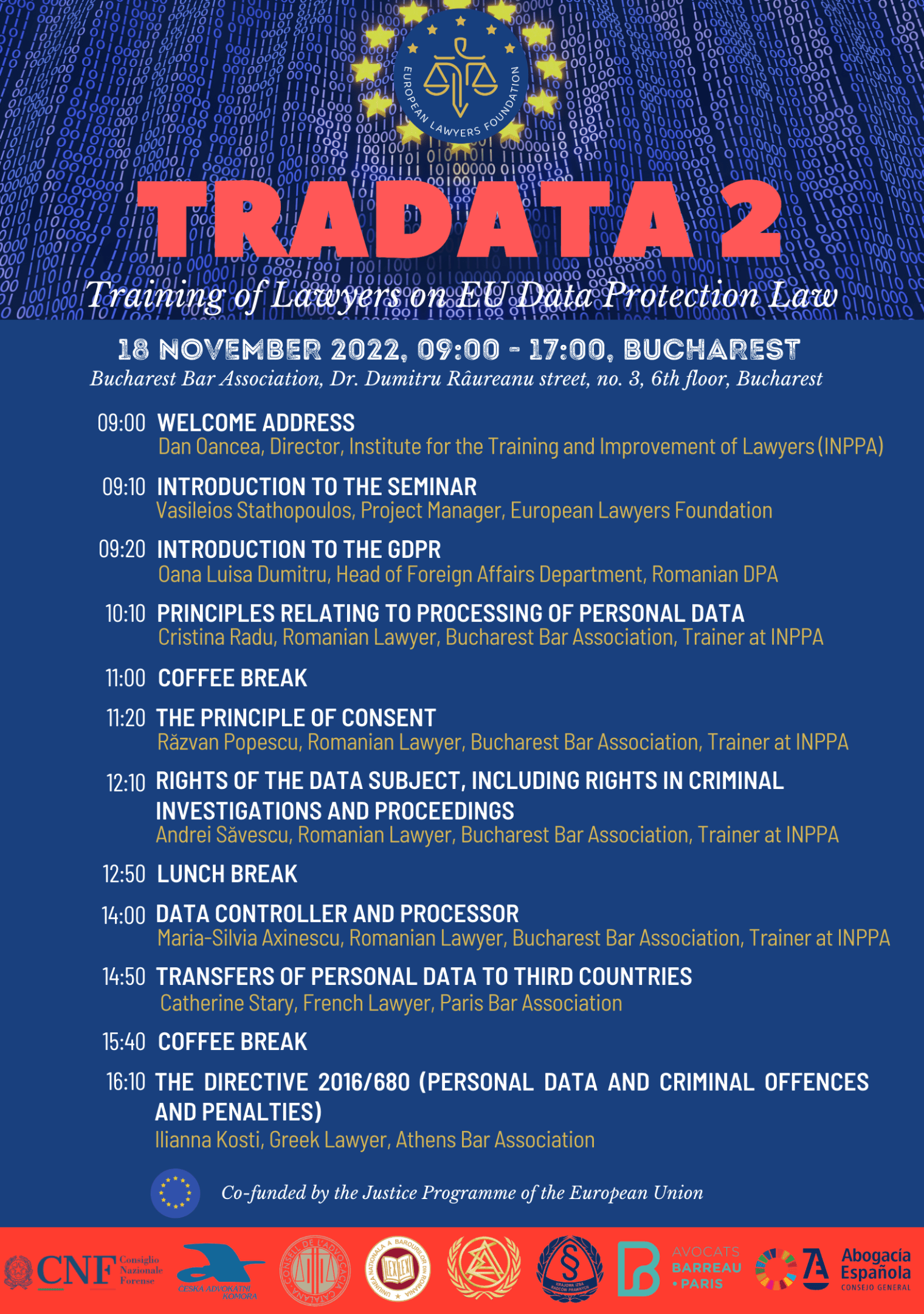 Uniunea Națională a Barourilor din România are calitatea de partener în cadrul proiectului TRADATA 2, coordonat de European Lawyers Foundation.