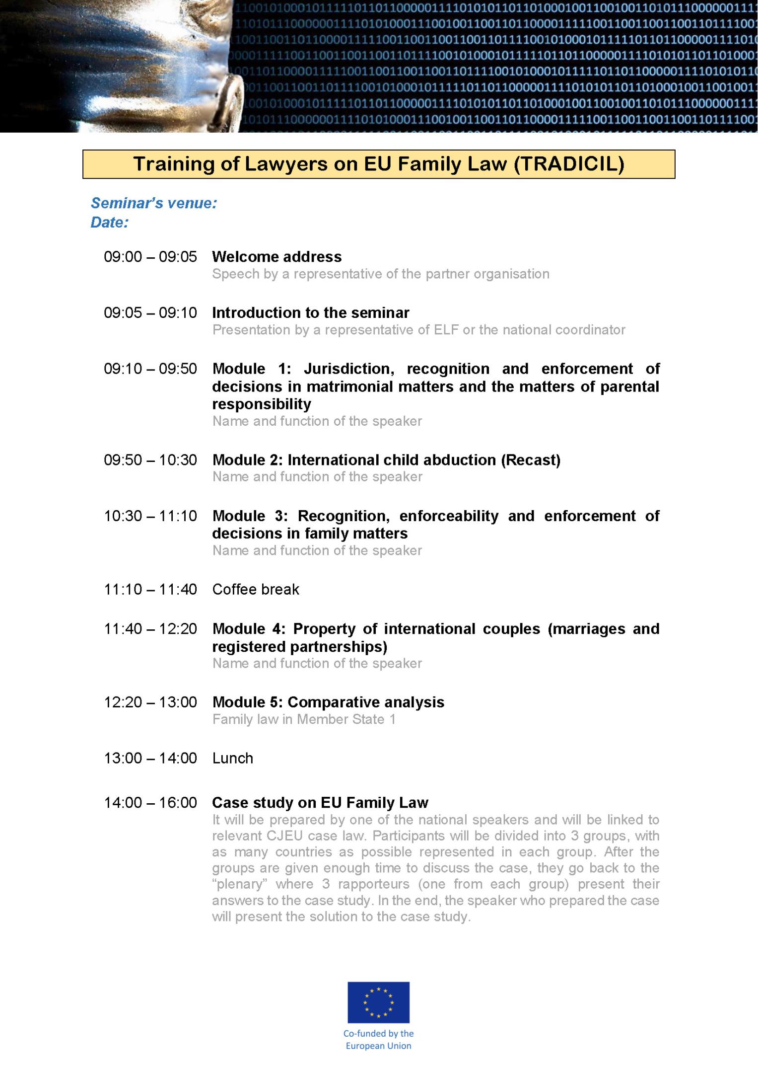 În cadrul proiectului cu finanțare europeană TRADICIL, va fi organizat la București, la 23 mai a.c. un seminar pe aspecte de dreptul familiei. Structura evenimentului poate fi descărcată aici: DOCX / PDF / JPG (updated)