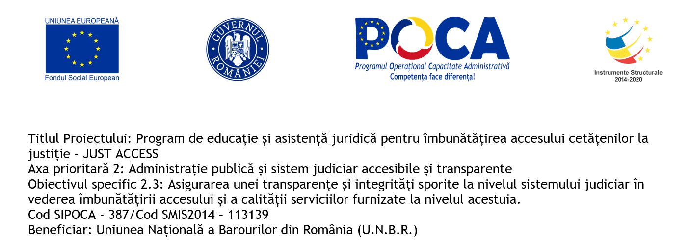UNIUNEA NAȚIONALĂ A BAROURILOR DIN ROMÂNIA, în calitate de Beneficiar implementează începând cu data de 22.06.2018, în parteneriat cu Fundația Centrul de Resurse Juridice (partener), proiectul “Program de educație și asistență juridică pentru îmbunătățirea accesului cetățenilor la justiție – JUST ACCESS”, contract de finanțare nr. 153/22.06.2018, finanțat prin Programul Operațional Capacitate Administrativă; Axa prioritară 2: Administrație publică și sistem judiciar accesibile și transparente; Obiectivul specific 2.3: Asigurarea unei transparențe și integrități sporite la nivelul sistemului judiciar în vederea îmbunătățirii accesului și a calității serviciilor furnizate la nivelul acestuia.