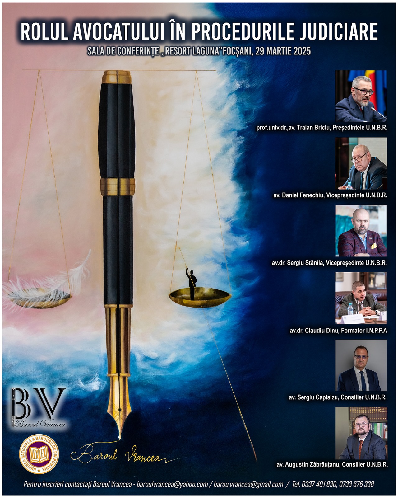 Esti aici: Prima Pagina / Uncategorized / La data de 29 martie 2025 va avea loc conferinta cu tema ”Rolul avocatului în procedurile judiciare”, organizată de Baroul Vrancea, cu sprijinul UNBR.