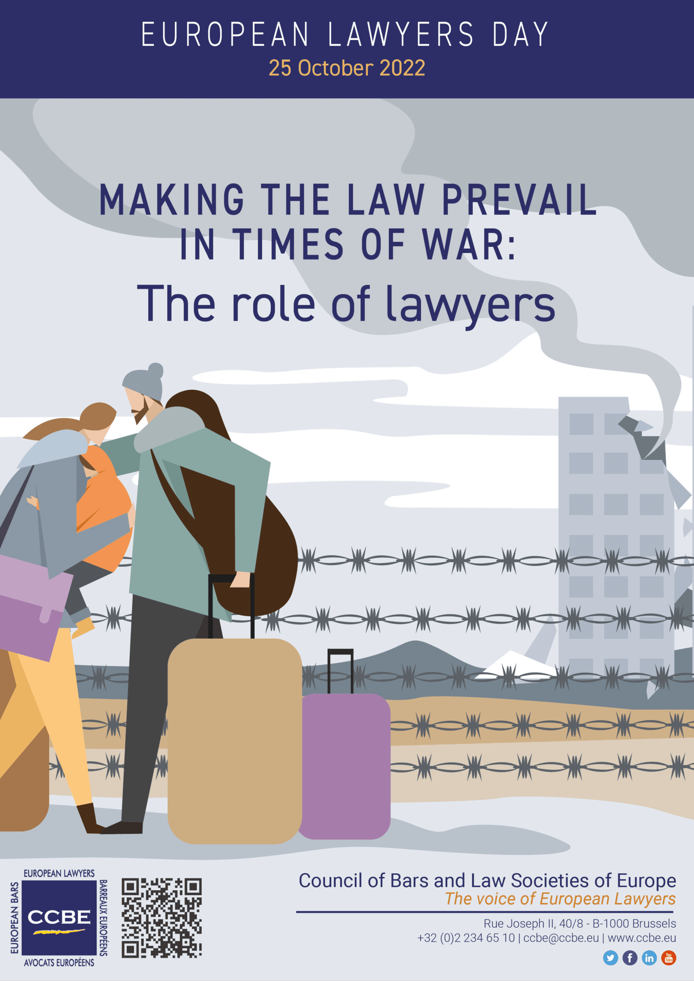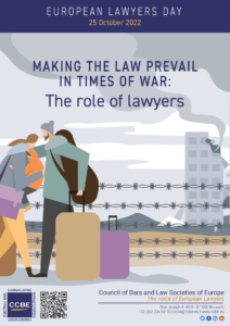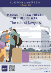 Tema propusă de CCBE – Consiliul Barourilor și Societăților de Drept din Europa pentru Ziua Europeană a Avocaților 2022 este despre „ Rolul avocaților în vremuri de război”. Tema evidențiază rolul important pe care avocații și barourile și societățile de avocatură îl pot juca într-un astfel de context de război. Este o oportunitate de a face lumină asupra diferitelor inițiative luate de Barouri și Societăți de Avocatură, precum și de avocați și firme de avocatură, ca reacție la crizele umanitare rezultate în urma conflictelor.