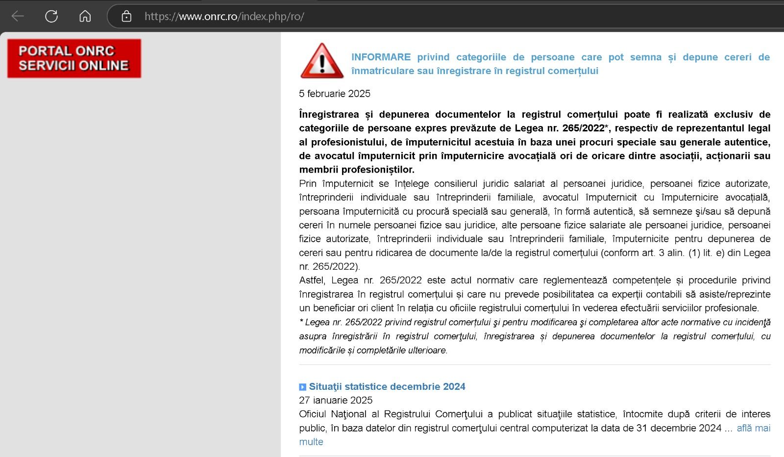 Astfel, Legea nr. 265/2022 este actul normativ care reglementează competențele și procedurile privind înregistrarea în registrul comerțului și care nu prevede posibilitatea ca experții contabili să asiste/reprezinte un beneficiar ori client în relația cu oficiile registrului comerțului în vederea efectuării serviciilor profesionale.