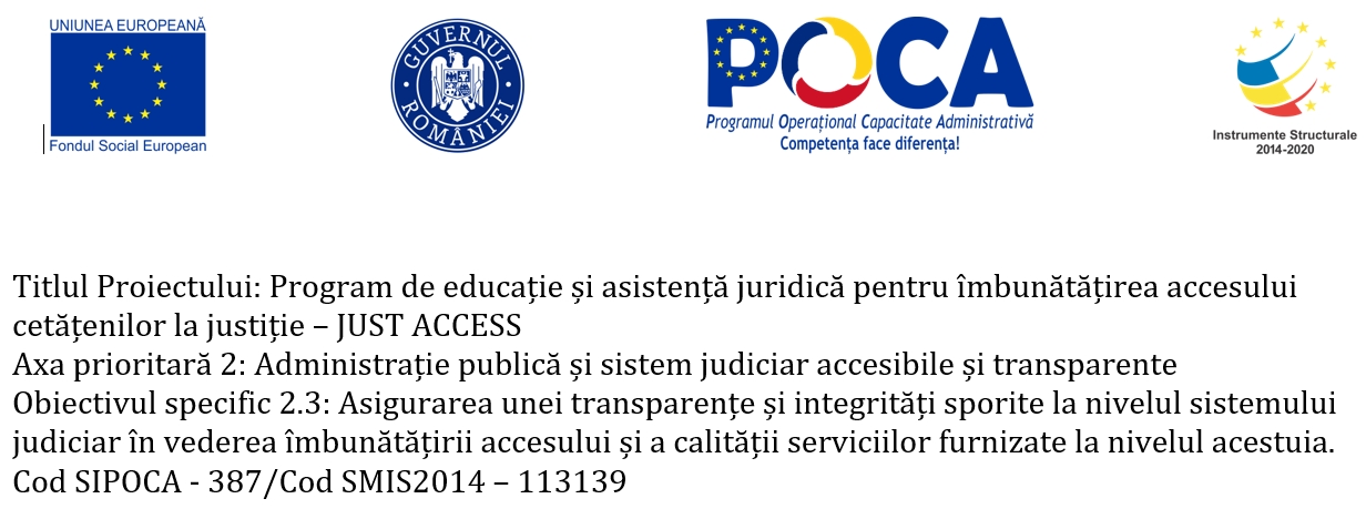 Proiectul implementat de Uniunea Națională a Barourilor din Romania (U.N.B.R.) în parteneriat cu Fundația Centrul de Resurse Juridice (CRJ), denumit ”Program de educatie şi asistenţă juridică pentru îmbunătățirea accesului cetățenilor la justiţie – JUST ACCESS” este finanțat în cadrul Programului Operaţional Capacitate Administrativă 2014-2020, axa prioritară 2 – Administrație publică și sistem judiciar accesibile și transparente, obiectivul specific 2.3: Asigurarea unei transparențe și integrități sporite la nivelul sistemului judiciar în vederea îmbunătățirii accesului și a calității serviciilor furnizate la nivelul acestuia.