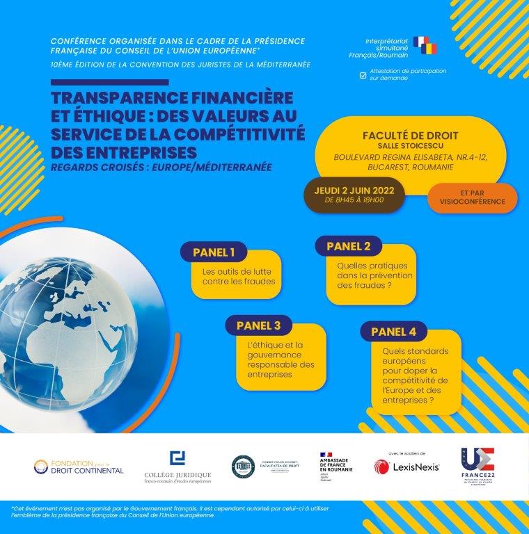 Informăm avocații că la 2 iunie a.c., va avea loc la Sala Stoicescu a Facultății de Drept a Universității din București va avea loc cea de a 10-a ediție a Convenției juriștilor din zona Mării Mediterane, în intervalul orar 08.45 – 18.00.