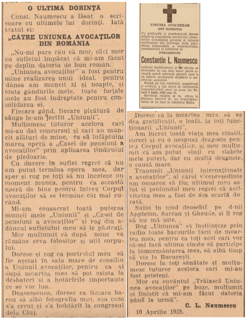 Joi, 3 iulie 2025, ora 09:30, Uniunea Națională a Barourilor din România organizează o slujbă de comemorare în Cimitirul Bellu (fig. 48, loc. 19), cu prilejul împlinirii a 90 de ani de la trecerea în eternitate a avocatului Constantin Naumescu, fost Președinte al Uniunii Avocaților din România, figură marcantă a avocaturii interbelice.