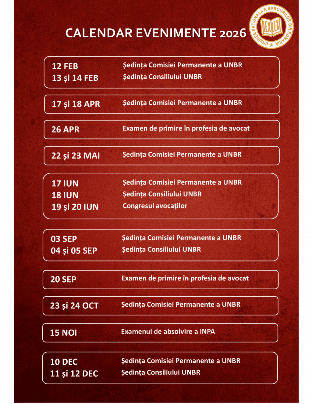 Uniunea Națională a Barourilor din România informează avocații, barourile și persoanele interesate cu privire la examenele de primire în profesia de avocat, examenul de absolvire al Institutului Național pentru Pregătirea și Perfecționarea Avocaților (INPPA), precum și la calendarul activităților profesionale pentru anul 2026.