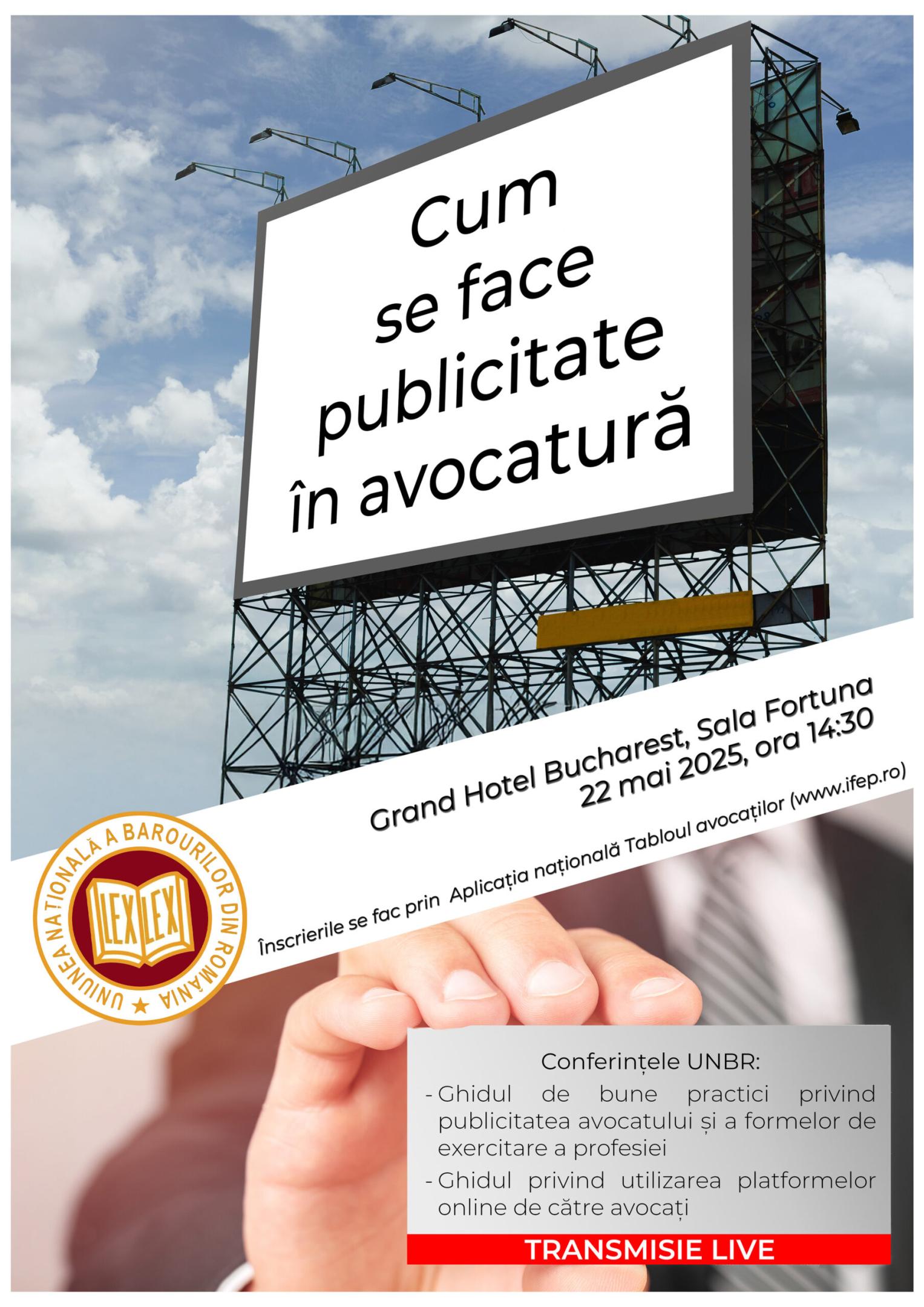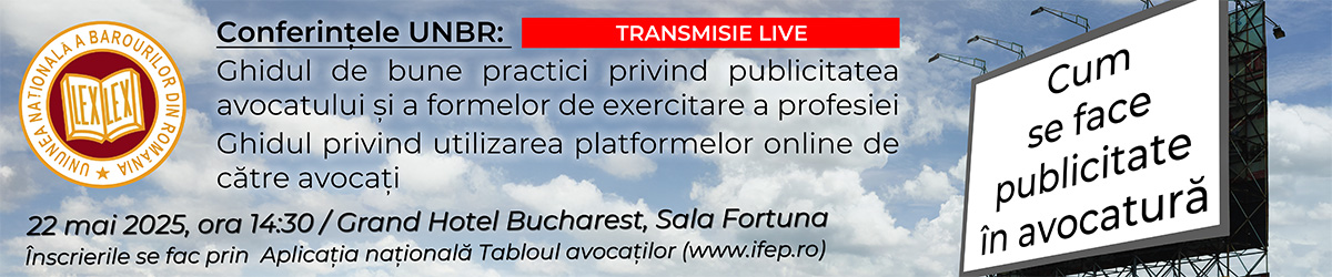 Uniunea Națională a Barourilor din România (UNBR) vă invită la dezbaterea „Cum se face publicitate în avocatură”, organizată în data de 22 mai 2025, începând cu ora 14.30 la Grand Hotel Bucharest.