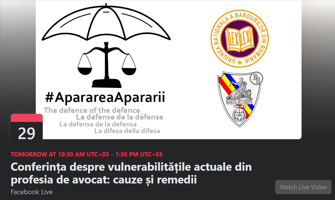 Uniunea Națională a Barourilor din România și Baroul București vă invită să luați parte la conferința cu tema Vulnerabilități actuale ale profesiei de avocat: cauze și remedii.