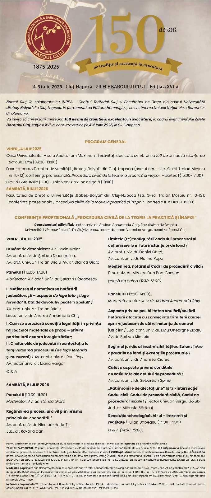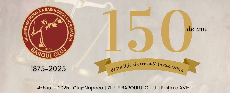 Baroul Cluj vă invită la aniversarea a 150 de ani de tradiție și excelență în avocatură, în cadrul evenimentului ”Zilele Baroului Cluj, ediția a XVI-a”, care va avea loc pe 04 – 05 iulie 2025, în Cluj-Napoca organizat în colaborare cu INPPA – Centrul Teritorial Cluj și Facultatea de Drept din cadrul Universității „Babeș-Bolyai” din Cluj-Napoca, în parteneriat cu Editura Hamangiu și cu susținerea Uniunii Naționale a Barourilor din România.